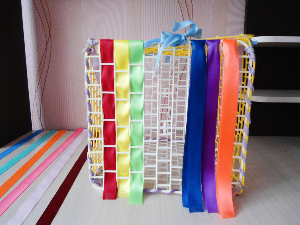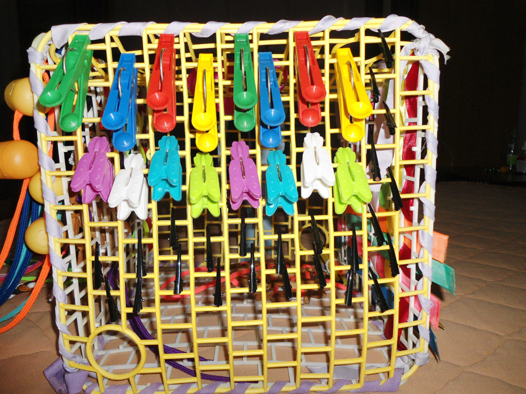 - Другая сторона тренажёра — с разноцветными лентами, которые можно наматывать на трубочки, палочки от мороженого, катушки для ниток или пронизывать через отверстия решётки вертикально или горизонтально, тем самым переплетая между собой, прикреплять к лентам разноцветные прищепки, заколки для волос.