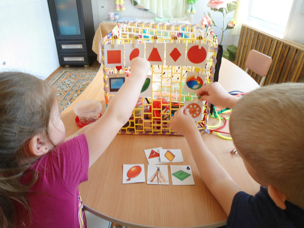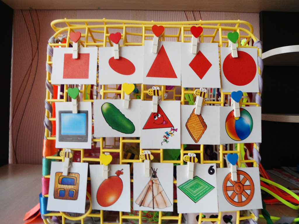 Материал: тренажёр «Куб», карточки с изображением геометрических фигур разного цвета и соответствующих им по форме предметов, декоративные прищепки.