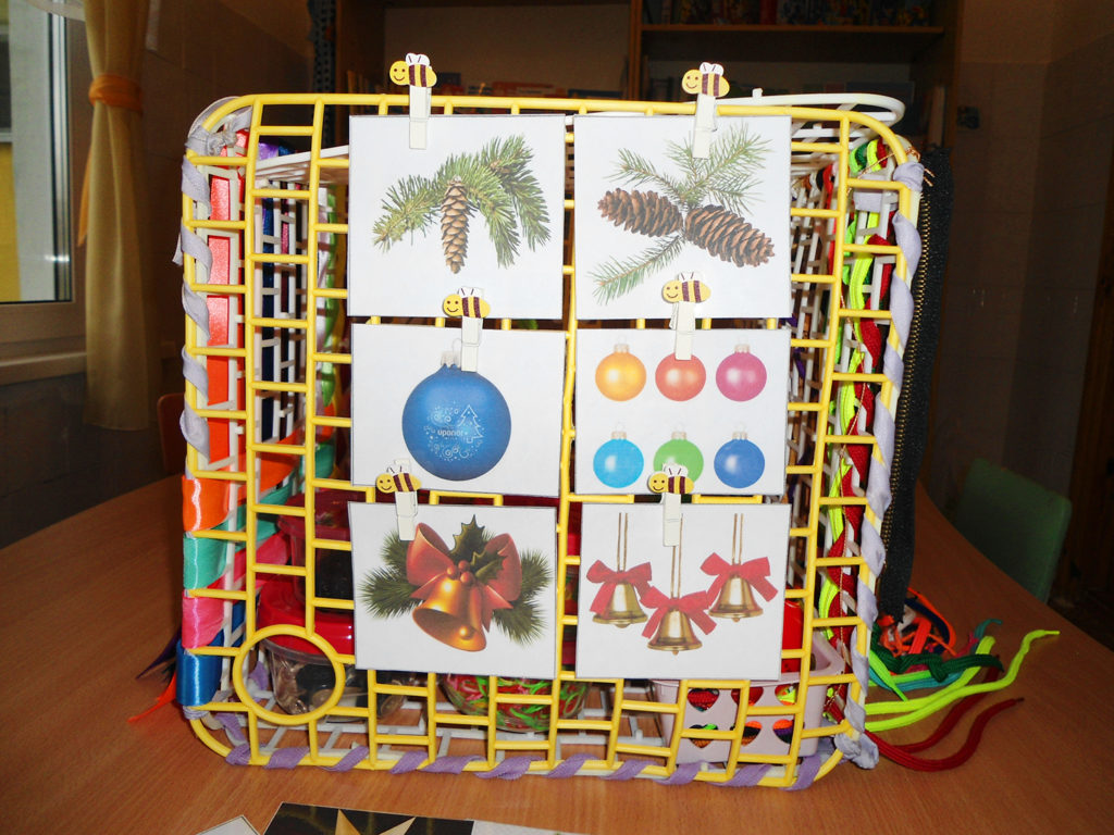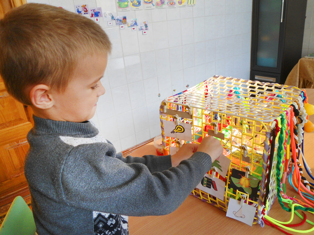 На четвёртой стороне тренажёра имеются небольшие выступы, на которые дети могут крепить резинки для плетения. Здесь можно размещать разнообразный наглядный материал.