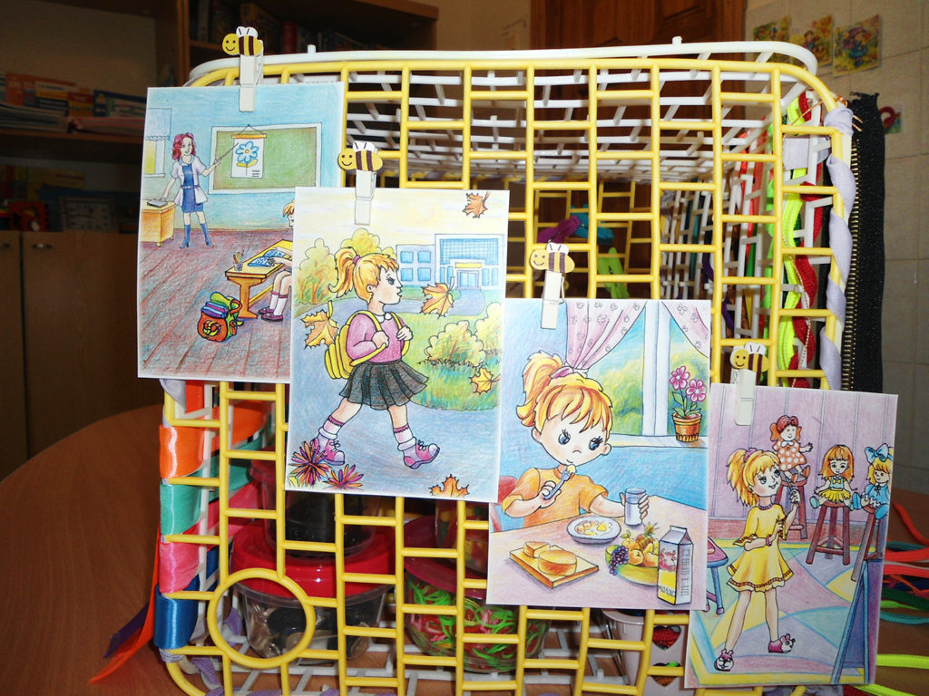 Для составления рассказа по серии сюжетных карточек ребёнок (дети) сначала раскладывает их на столе в нужной последовательности, описывая изображение на каждой. Затем поочерёдно прикрепляет карточки на тренажёр и повторяет рассказ.
