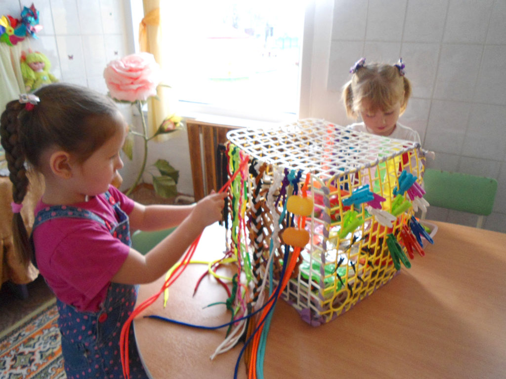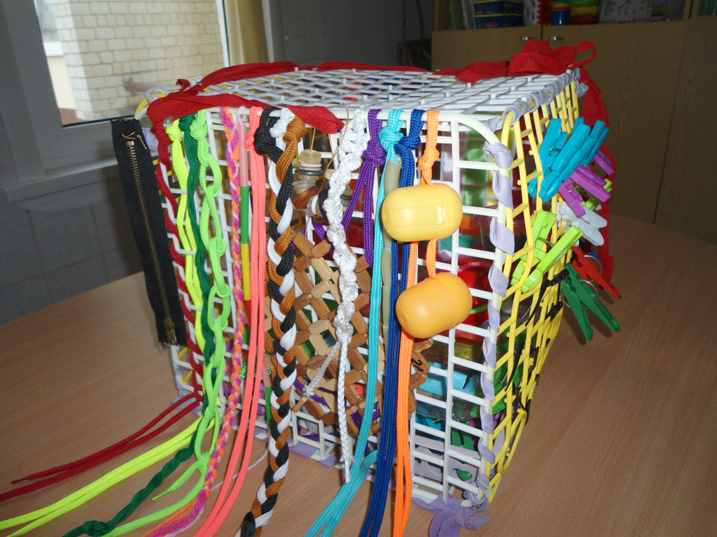 Дети смогут плести косички, цепочки, перекручивать их между собой, пронизывать через отверстия решётки в разных направлениях, завязывать узелки, закреплять на них контейнеры от киндер-сюрпризов, нанизывать макаронные изделия, трубочки, «пришивать» к решётке разные предметы (в частности деревянную подставку для еды), наматывать шнуры на палочки от мороженого, катушки для ниток, расстегивать—застёгивать молнии.
