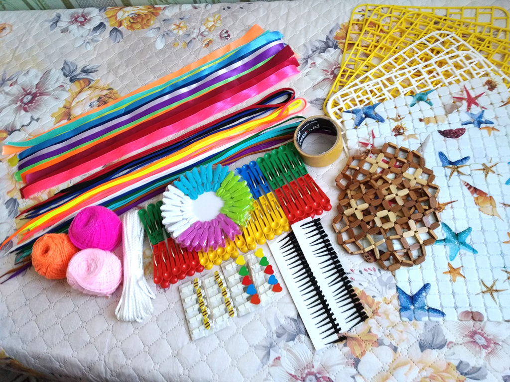 Материал для изготовления тренажёра: 6 одинаковых решёток для раковин квадратной формы, разноцветные ленты, шнурки, нитки для вязания, бельевая верёвка, прищепки разных размеров, заколки для волос, молнии для одежды, резинки для плетения.