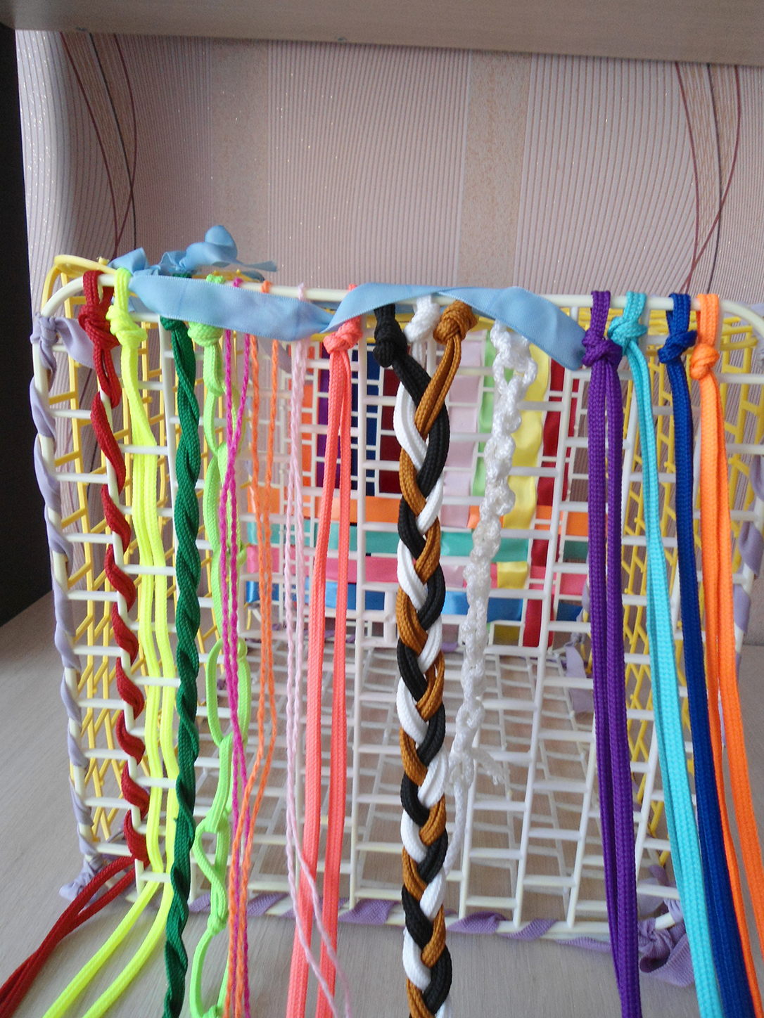 Дети смогут плести косички, цепочки, перекручивать их между собой, пронизывать через отверстия решётки в разных направлениях, завязывать узелки, закреплять на них контейнеры от киндер-сюрпризов, нанизывать макаронные изделия, трубочки, «пришивать» к решётке разные предметы (в частности деревянную подставку для еды), наматывать шнуры на палочки от мороженого, катушки для ниток, расстегивать—застёгивать молнии.