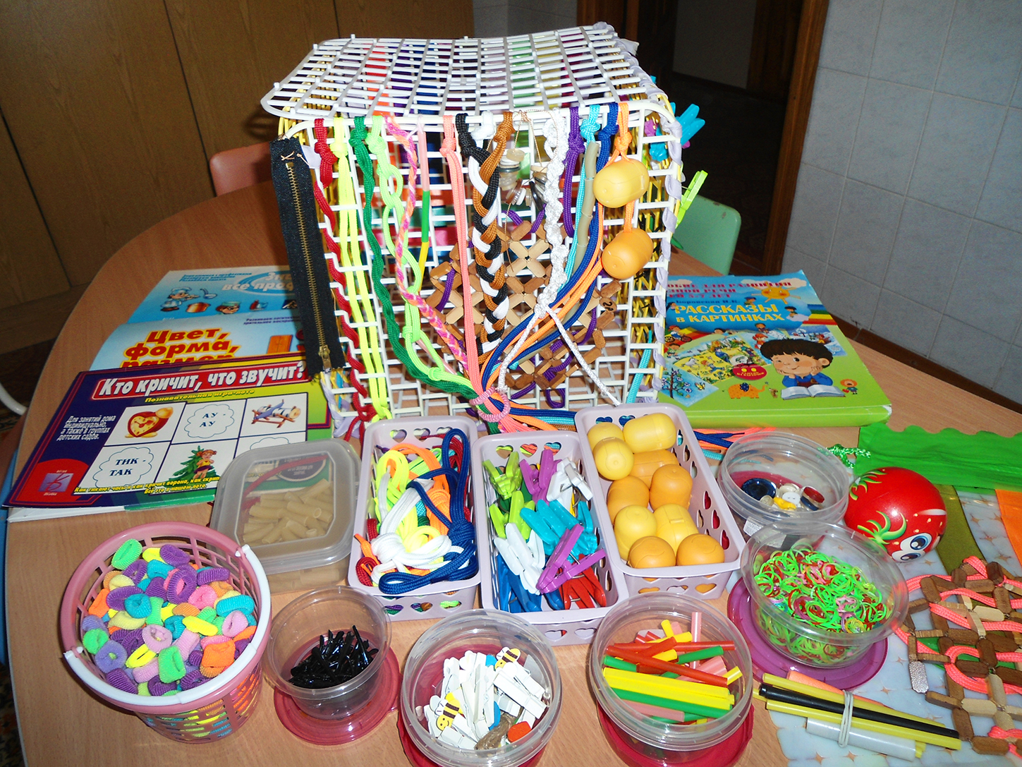 Материал для изготовления тренажёра: 6 одинаковых решёток для раковин квадратной формы, разноцветные ленты, шнурки, нитки для вязания, бельевая верёвка, прищепки разных размеров, заколки для волос, молнии для одежды, резинки для плетения.
