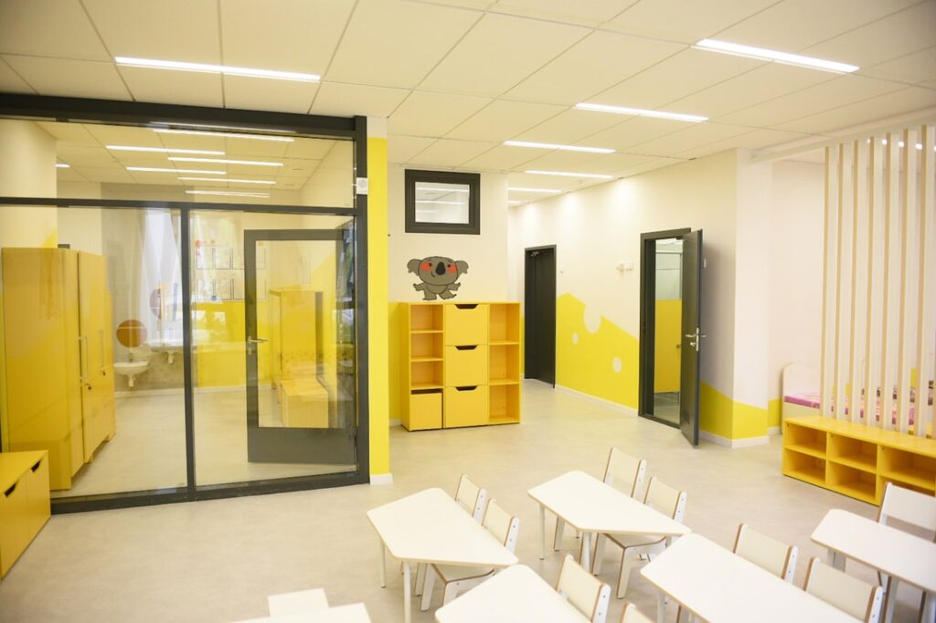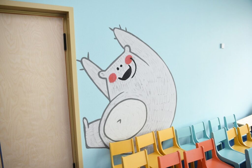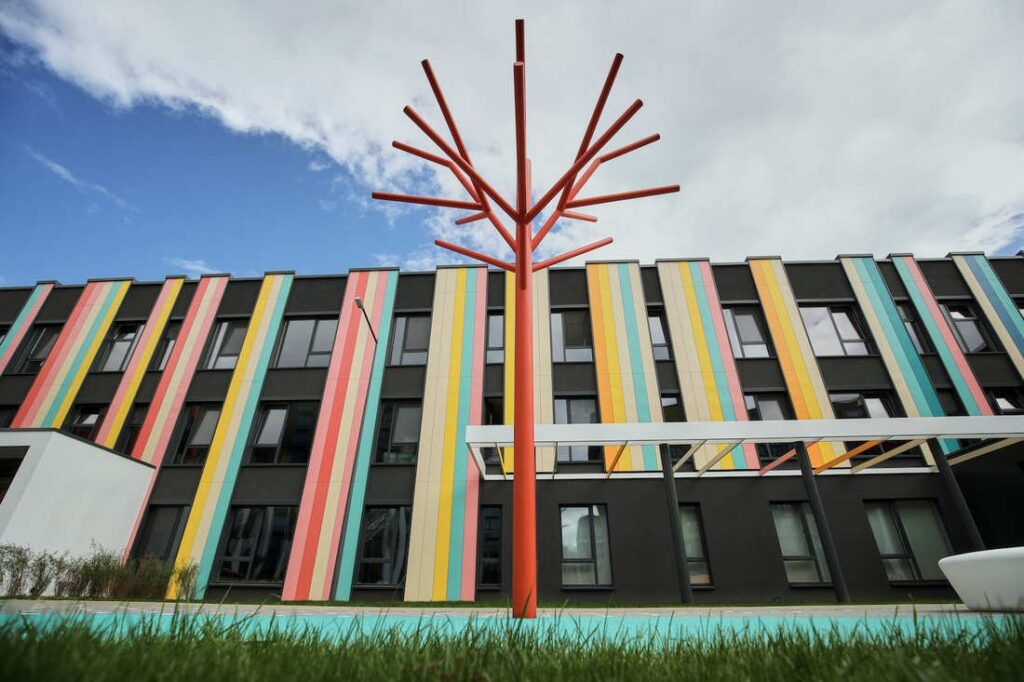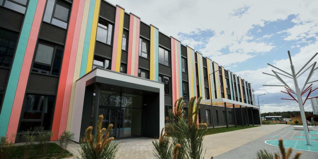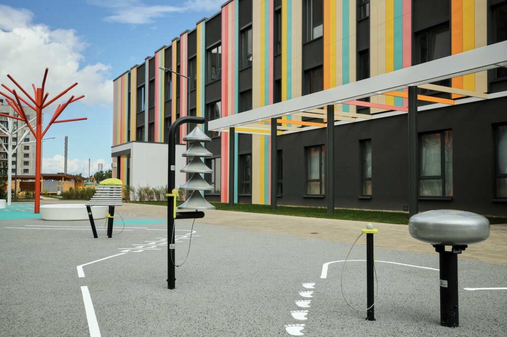 В Новой Боровой, что в д.Копище под Минском, возвели детский сад для 230 воспитанников от 3-х до 6-ти лет. Фасад оформлен яркими полосками и напоминает коробку с карандашами. Стены комнат и игровые площадки вызывают ассоциации с детской раскраской.