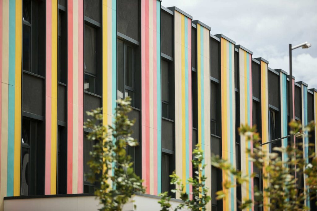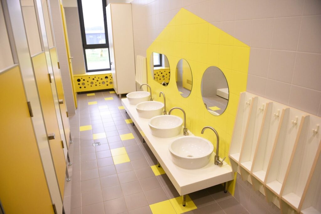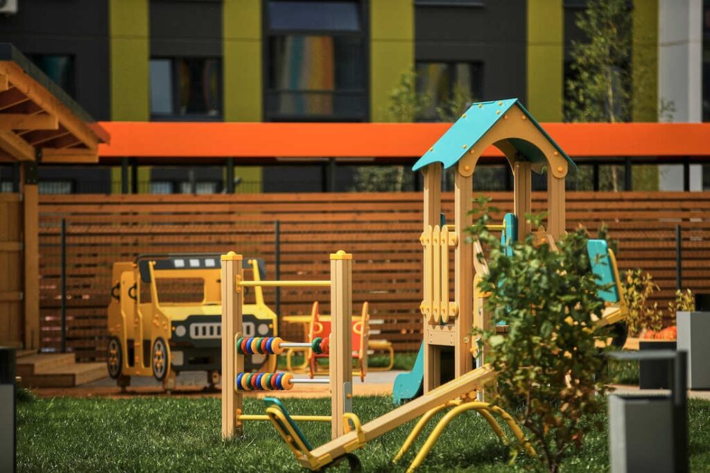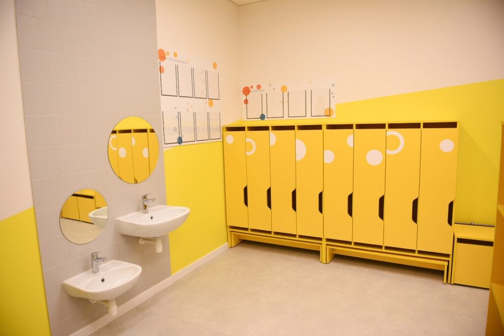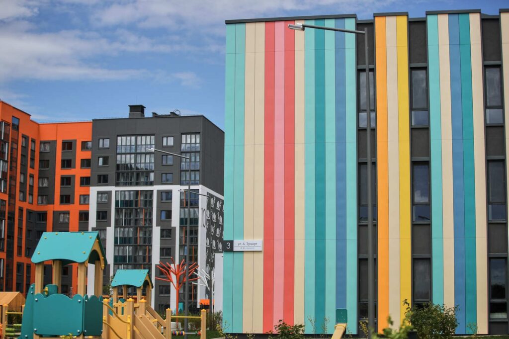 В Новой Боровой, что в д.Копище под Минском, возвели детский сад для 230 воспитанников от 3-х до 6-ти лет. Фасад оформлен яркими полосками и напоминает коробку с карандашами. Стены комнат и игровые площадки вызывают ассоциации с детской раскраской.
