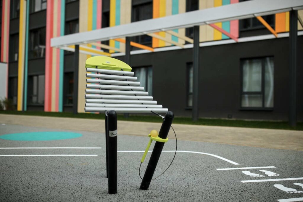 Главная площадка с обратной стороны здания покрыта безопасным прорезиненным покрытием двух цветов и обустроена скамейкой-пончиком, фантазийными деревьями (такими, как их рисуют дети) и музыкальными инструментами. Рядом разбит мини-огород.