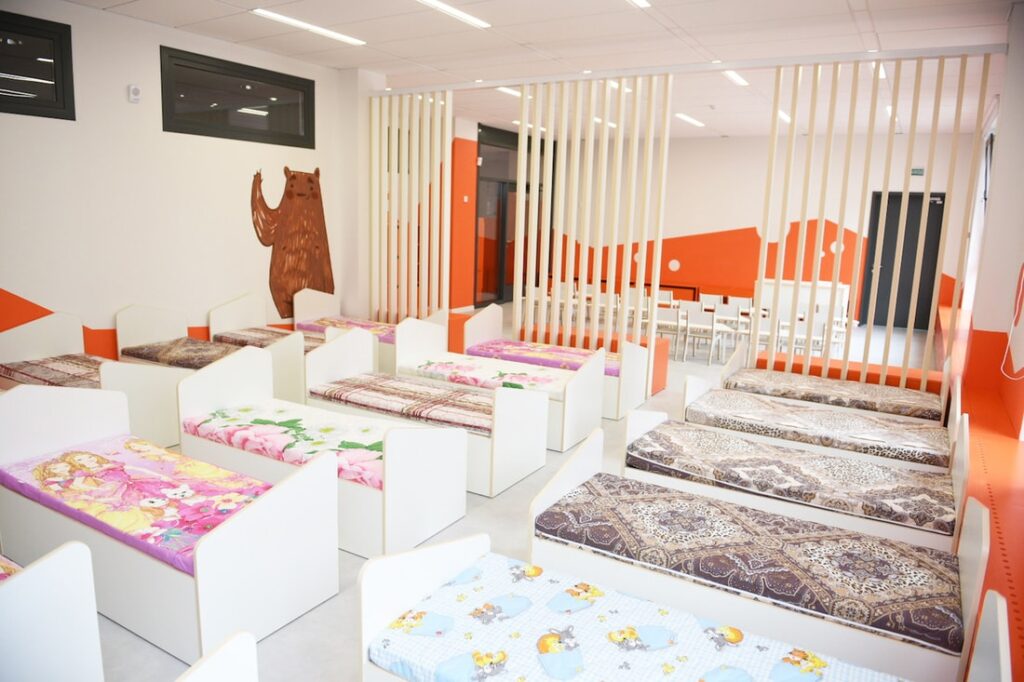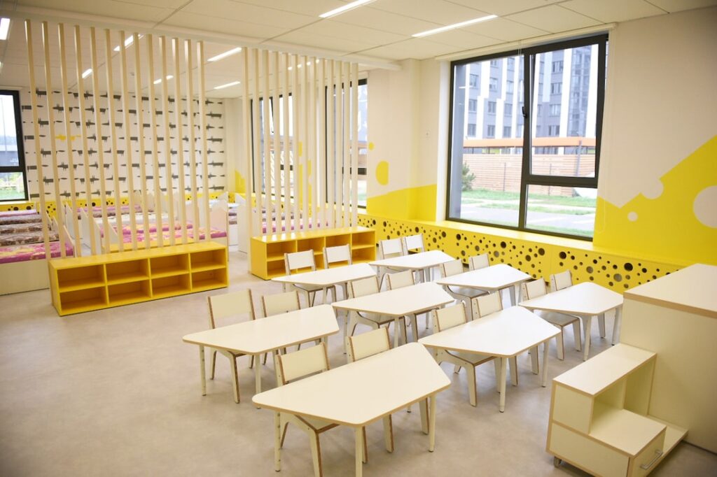 В трёхэтажном здании широкие коридоры и большие окна. Есть большой физкультурный зал, концертная комната для занятий танцами и музыкой, оснащённый пищеблок, предусмотрены кабинеты педагога-психолога и учителя-дефектолога. Продуман медицинский блок с двумя палатами и панорамными окнами во двор, который разделён на 12 игровых площадок с верандами и теневыми навесами. Для воспитанников установлены балансиры, горки, качели, машинки, вертолёты, песочницы и гигантские счёты. Правила дорожного движения можно изучать в мини-квартале с дорожной разметкой, а на небольшом поле с воротами и кольцами — поиграть в футбол и баскетбол.
